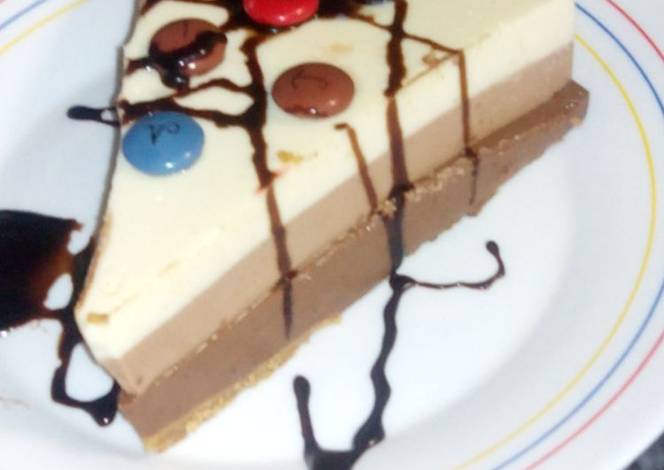 - Ahora vamos ya con la última capa de chocolate, que es la de chocolate blanco. Ponemos los 500 ml de mezcla de nata y leche que nos queda, el chocolate blanco y el sobre de cuajada. Aquí no ponemos azúcar. Removemos hasta que hierva y volvemos a echarla encima de la otra capa de chocolate de la misma forma, o sea con el cucharón y con mucho cuidado.